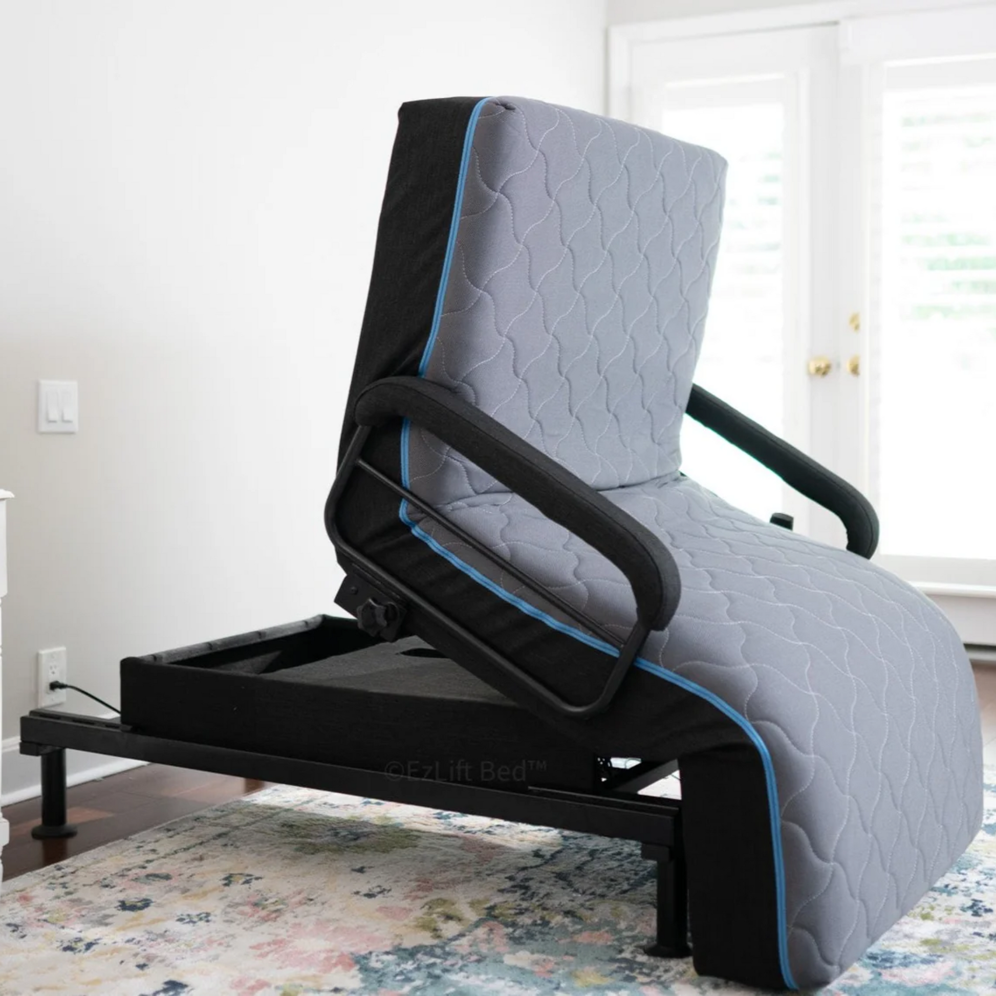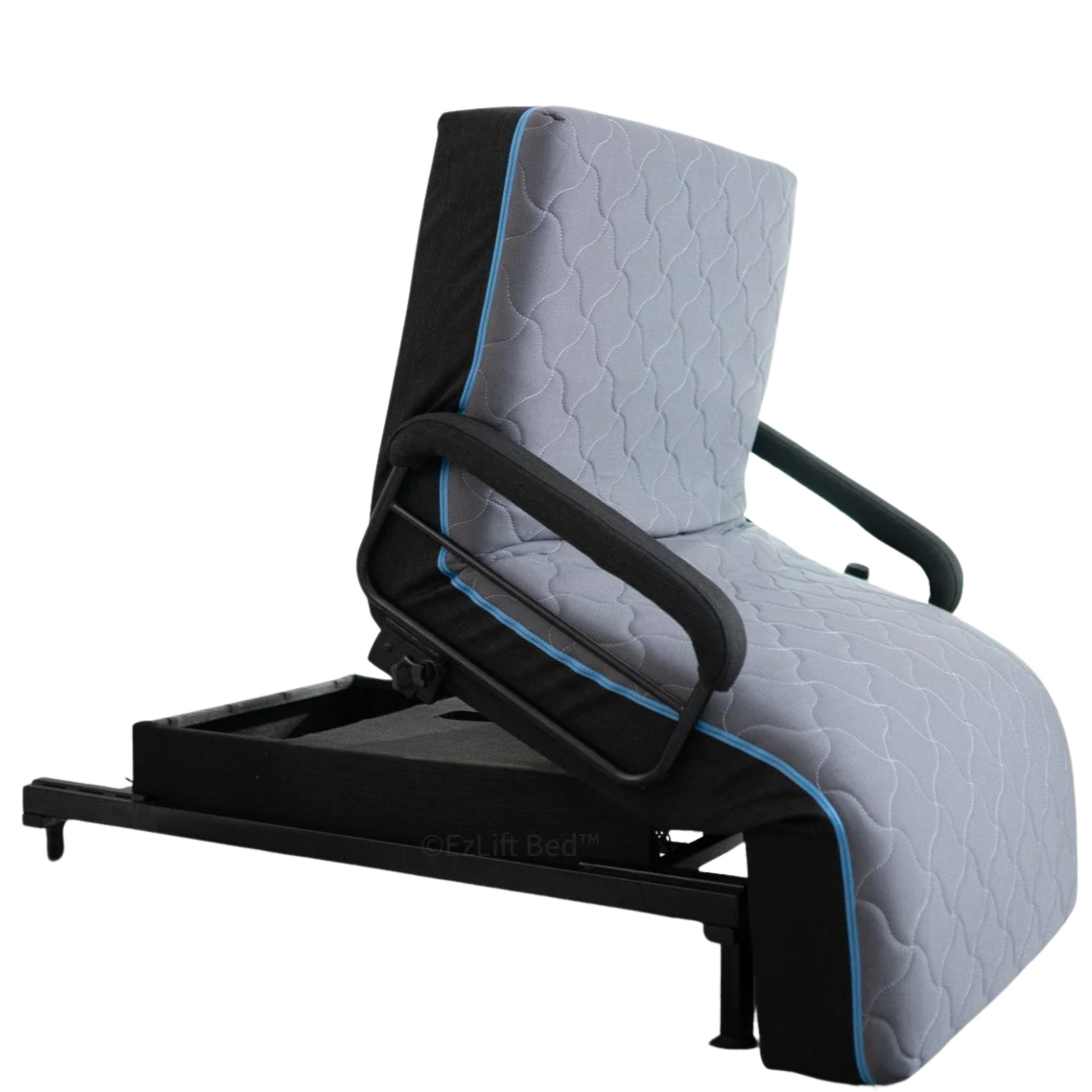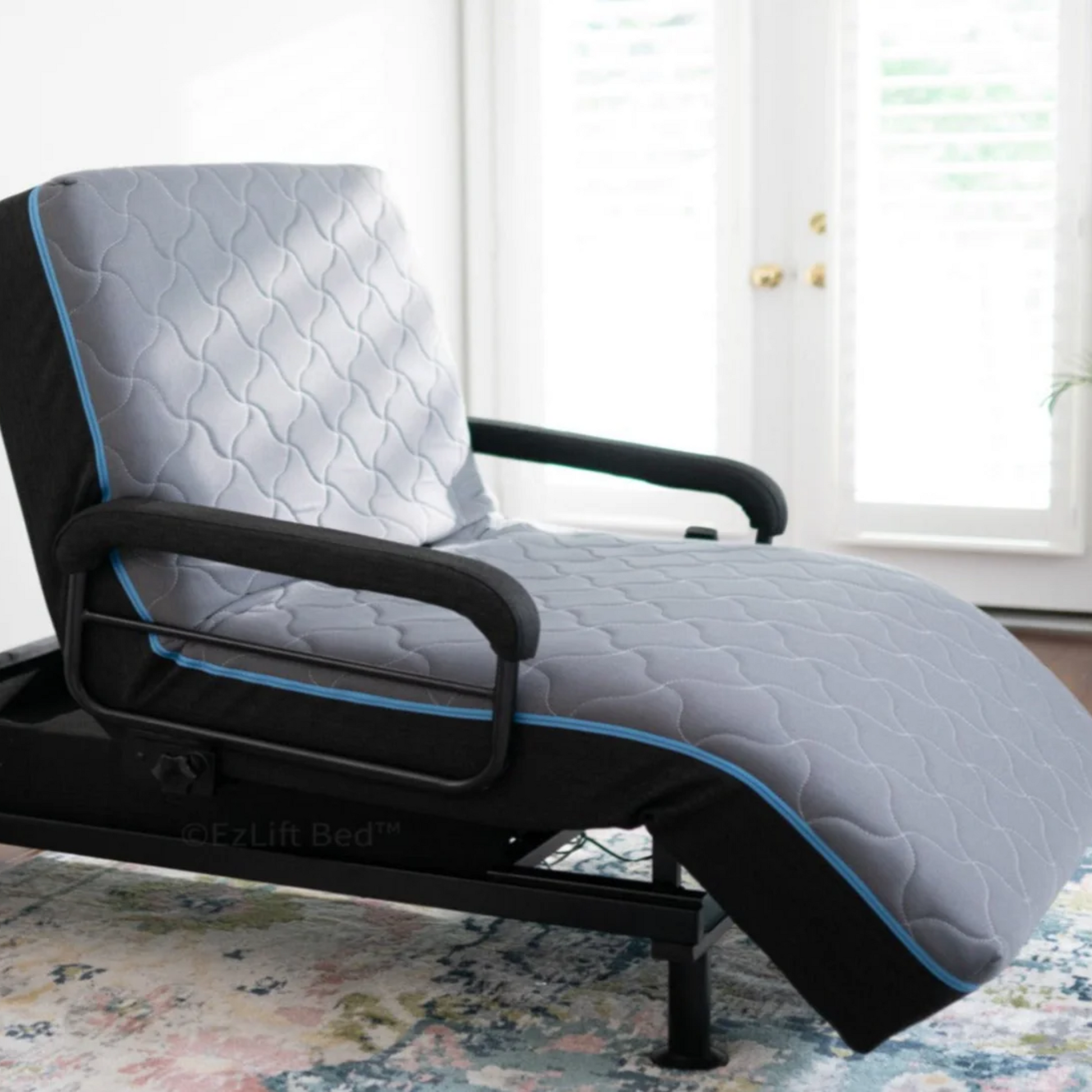 The ComfortRise Flex-Lounger Bed blends day-chair relaxation with nighttime pressure relief, thanks to its tri-zone articulation and breathable quilted cover accented by sky-blue piping. Seamless seat-lift technology makes standing easier, while the low-profile base fits elegantly into any bedroom or living space.